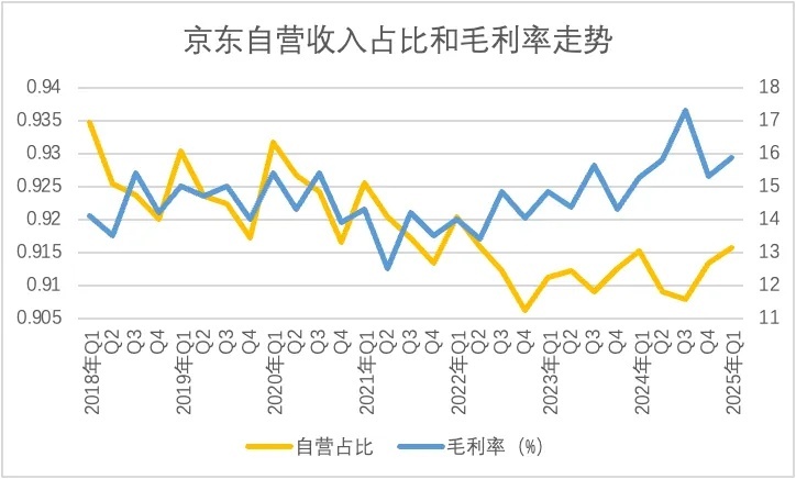 After 2023, this trend reversed, with self-operated share and gross margin rising in tandem. By Q1 2025, self-operated share had returned to a two-year high (outpacing open platform growth). This seems counterintuitive: self-operated gross margins are typically lower than open platforms, so higher self-operated share should theoretically dilute margins. Reality, however, defies theory.