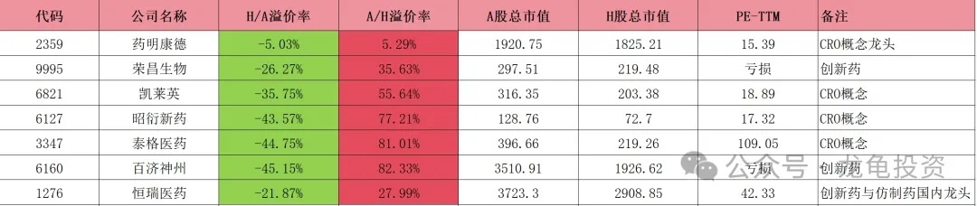 Back then, the A/H premium for CRO stocks wasn't as wide as it is now. The current gap is staggering, making A-share investors seem relatively fortunate (finding solace in hardship). Here’s the current premium situation for innovative drug CRM concept stocks: