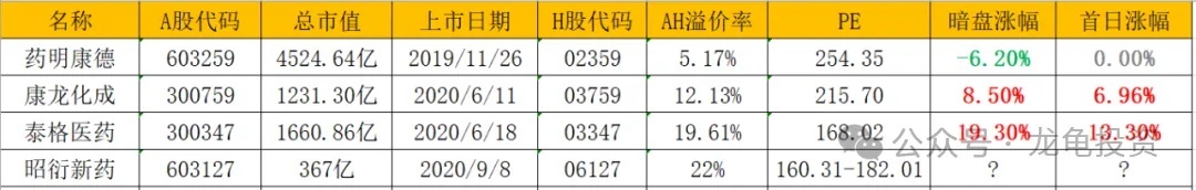For dual-listed A/H shares, the upside is often limited by A-share performance. However, when analyzing the A/H premium, I recalled the 2020 IPO of Tigermed, a CRO concept stock dual-listed in A/H shares, which gained 19.30% in the gray market and 13.30% on its debut. At the time, I participated in the subscription and was allocated three lots. While I can't find the original article, I still have the A/H premium table for CRO concept stocks from that period.