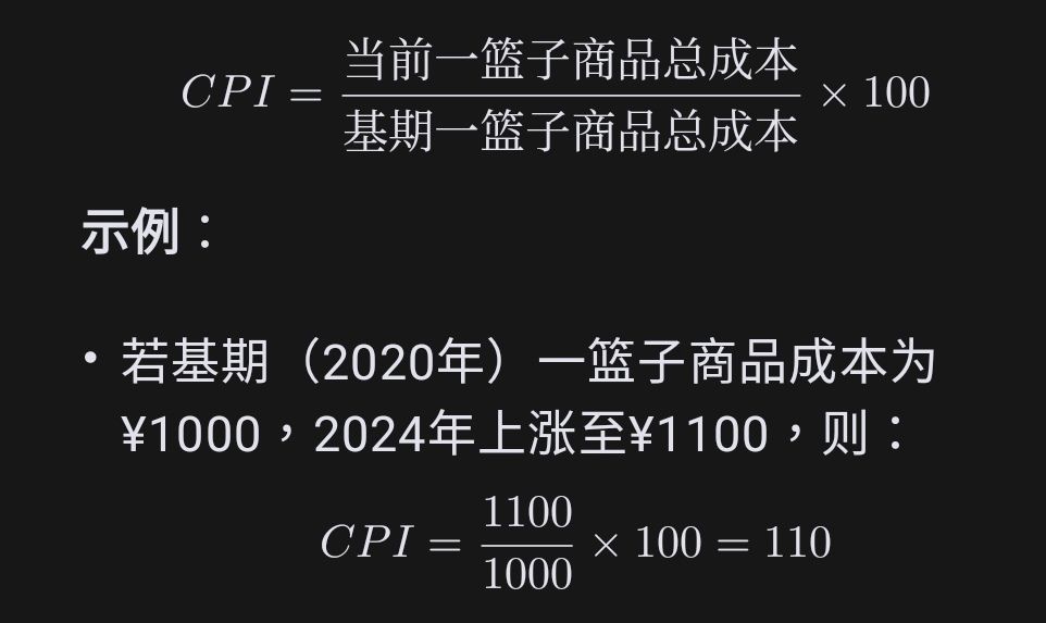 - 计算当前价格与基期(参考年份)价格的比率,加权平均后得出 CPI。