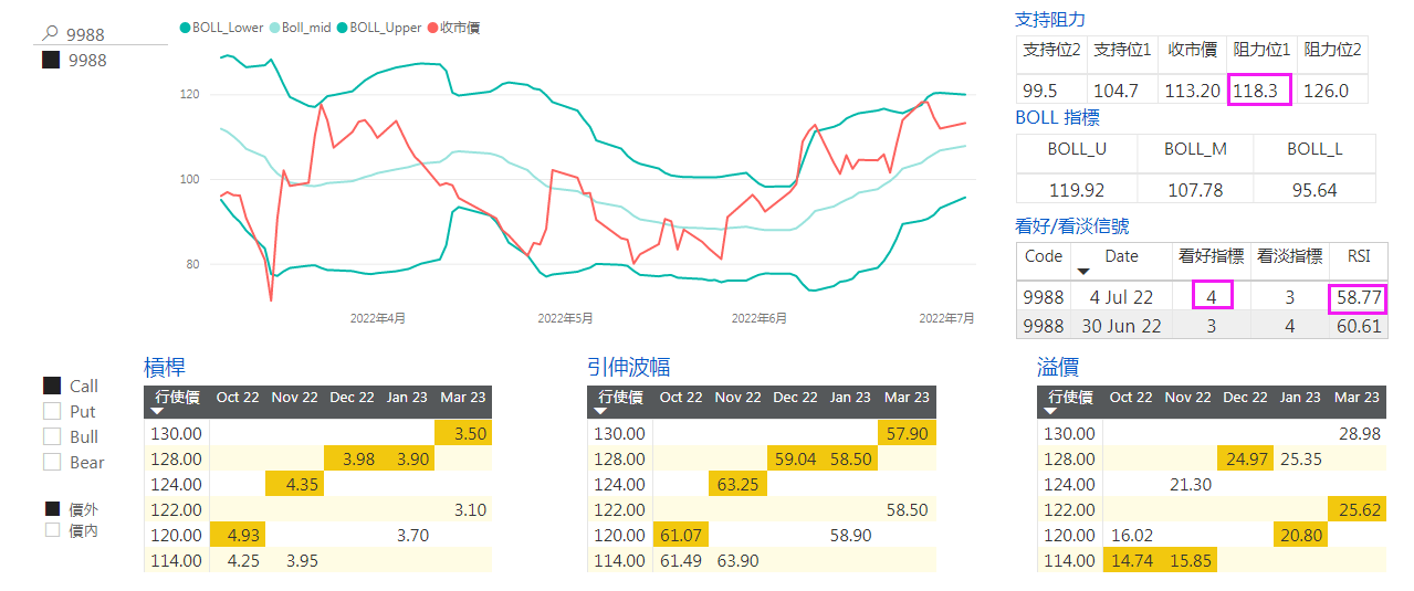 昨日 Y 模型點評 9988 有承接,支持 110。昨日收 113.2。今日承接升勢,相關牛證 56014 升 23.12%;55902 升 26.15%