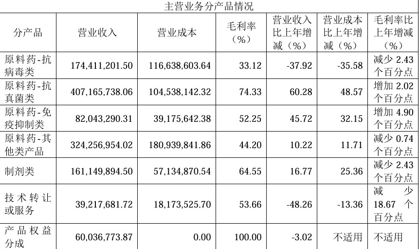 Judging from the above data alone, 博瑞医药's raw material drug business has always maintained an upward trend, but the sub-segments have already shown fluctuations, the most obvious being the antiviral category. According to the financial report, in 2024, 博瑞医药's antiviral product income decreased by 37.92% compared to the same period last year, mainly due to the impact of changes in flu trends, and the demand and price of Oseltamivir raw materials fluctuated.