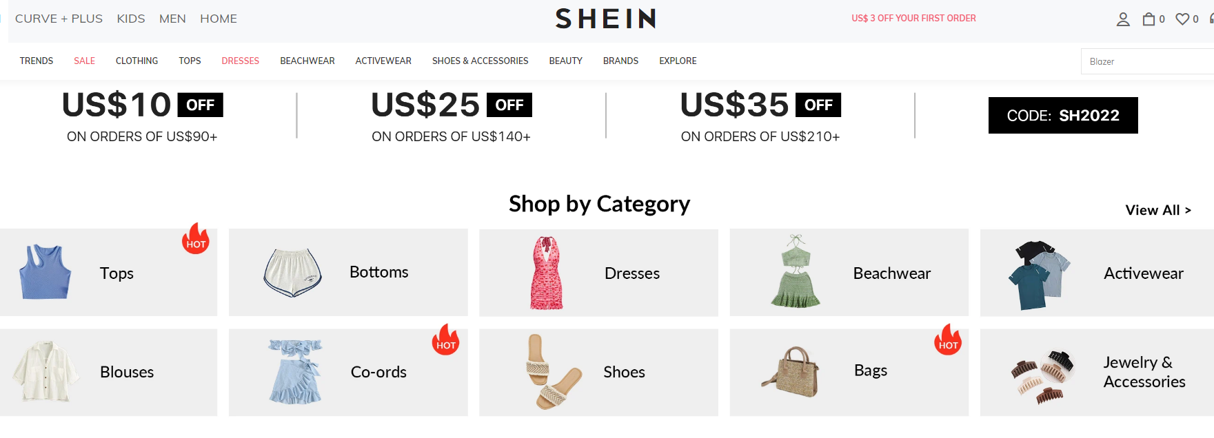 在 SHEIN 的官网上,10 美元以下日常服饰非常多,并且在浏览网站购物时,会不停地弹出很多优惠券,很有拼多多的风格。花得少,还能够买到新款的衣服,SHEIN 彻底抓住了许多年轻消费者的心理。