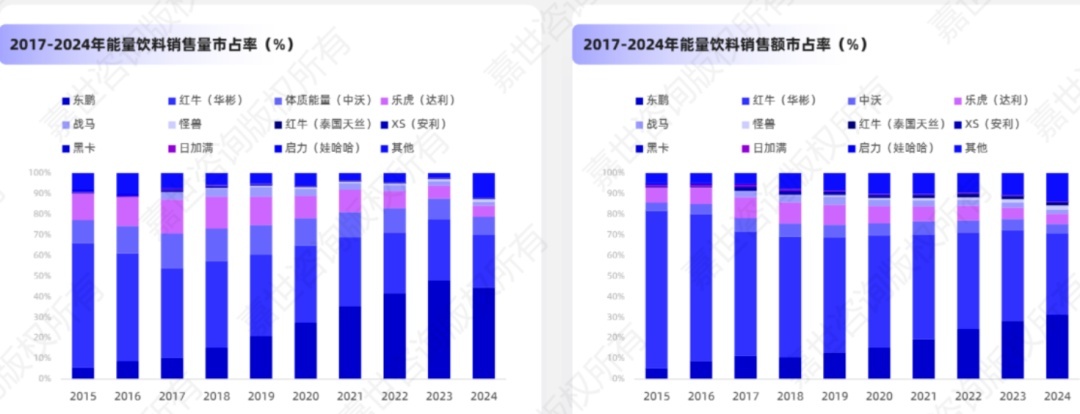 Looking at Dongpeng Special Drink's history, its growth inflection point came after 2016, when Red Bull faced brand ownership disputes, losing market share. Domestic brands like Dongpeng seized the opportunity to rise. By sales volume, Dongpeng surpassed Red Bull in 2021 and has since led China's functional drink market for four consecutive years. In 2024, Dongpeng held a 44.5% market share by sales volume, far ahead of Red Bull's 25.5%. In terms of sales revenue, Red Bull (39.1%) still leads due to premium pricing, but Dongpeng (31.2%) is closing the gap. Currently, the combined market share of the top two (Dongpeng + Red Bull) exceeds 70%, marking a duopoly.