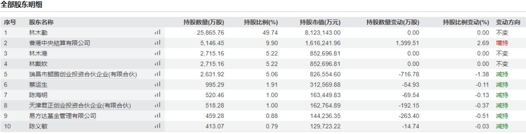 Lin Muqin is the chairman (founder) of Dongpeng Beverage. Lin Yupeng, the controller of Kunpeng Investment, is Lin Muqin's son, while Lin Daiqin is his nephew, and Lin Mugang is his brother. Additionally, Chen Huanming, a limited partner in Kunpeng Investment, and Chen Haiming (holding 1.09%), the eighth-largest shareholder, are brothers of Lin Muqin's wife, Chen Huiling. Thus, the Lin Muqin family holds approximately 67.71% of shares.