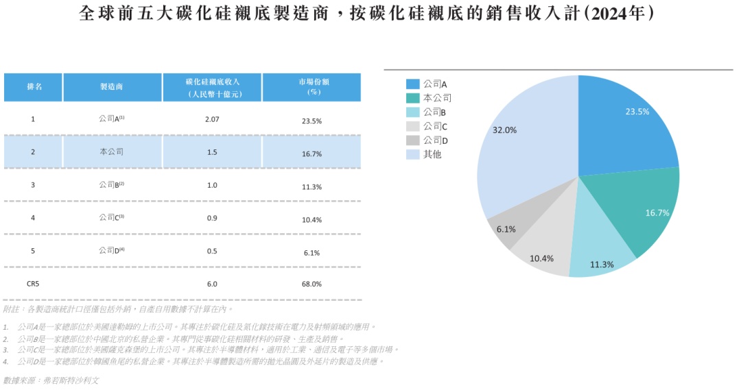 The company has been deeply involved in the wide-bandgap semiconductor materials industry, with strong professional technical capabilities. Since its establishment, it has focused on the R&D and industrialization of silicon carbide substrates. According to Frost & Sullivan, based on the sales revenue of silicon carbide substrates in 2024, we are one of the top three global manufacturers of silicon carbide substrates, with a market share of 16.7%.