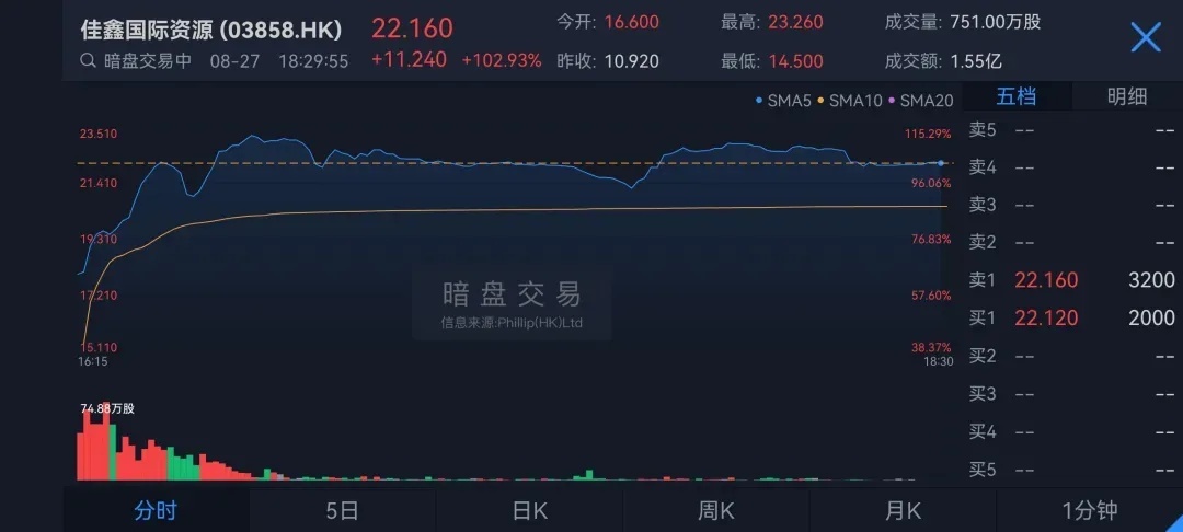 Yesterday, $JIAXIN INTL RES(03858.HK) opened 50% higher in the dark pool, and unlike the previous few stocks, although there was a brief pullback midway, it did not plummet after rising later, finally closing up 103%.