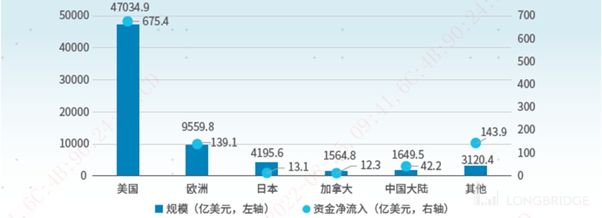 2022 年二季度,全球权益类 ETF 规模合计 6.7 万亿美元,资金净流入 1026 亿美元。其中美国市场权益类 ETF 规模最大,达到 4.7 万亿美元,尽管市场大幅下跌但资金依然净流入 675.4 亿美元,欧洲市场 ETF 资金流入 139.1 亿美元,中国大陆市场净流入 42.2 亿美元。