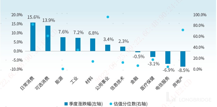 2022 年 Q2,A 股市场 11 个大行业板块中,疫后修复反弹逻辑支持下的日常消费(15.6%)和可选消费(13.9%)领涨,房地产板块领跌(-8.5%)。能源、电信服务、金融、信息技术、材料、以及医疗保健板块估值已调整至历史较低分位数水平(<30%)。