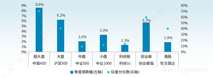 2022 年 Q2,国内外出现了一些边际利好因素,中国市场主要指数在 4 月触底反弹,大盘风格显著跑赢中小盘,MSCI 中国 A50 指数录得 8.6% 的涨幅。科创 50、中证 1000、中证 500 指数的估值进入历史底部水平(<20%)。