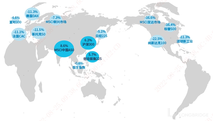 2022 年二季度全球主要经济体市场中仅 A 股表现较好,全球其他主要市场指数均大幅下跌,其中纳斯达克 100 指数跌幅达到 22.5%,标普 500 指数跌幅 16.4%,欧洲市场中德国 DAX 和法国 CAC 分别下跌 11.3% 和 11.1%。