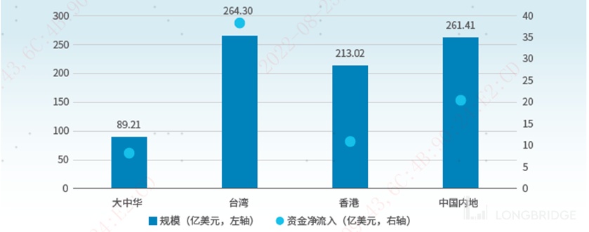 2022 年二季度,海外投资中国主题 ETF 产品(不含香港)规模达到 827.9 亿美元,净流入 77.9 亿美元。其中投资中国内地主题 ETF 规模达到 261.4 亿美元,净流入 20.5 亿美元。