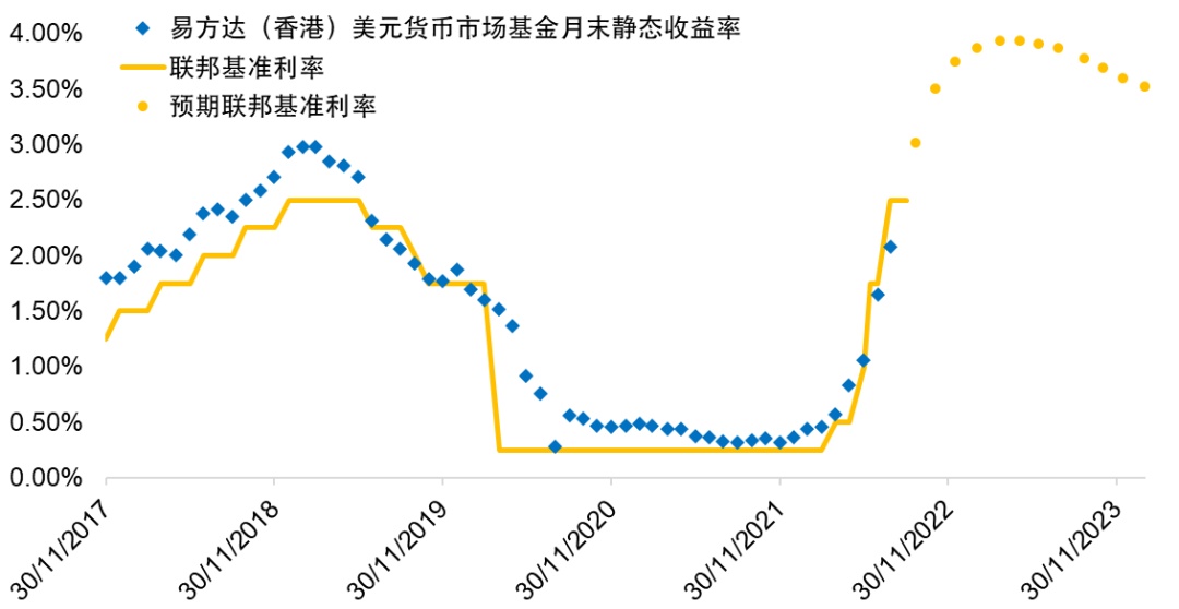 说起货币基金,大家应该都不陌生。面对今年的投资环境,一方面,美元及其联系汇率之币种的货币基金无疑是加息周期直接受益的投资品种之一,伴随联储升息,银行存款、银行存单、短期债券等收益率亦走高,美元货基底层的到期收益率也从 0.3%-0.4% 升至 2.5%-3.0% 水平;另一方面,相较其他波动大、负回报的投资品种来说,作为高流动性的现金管理工具,货币基金无疑是收益率波动较小的。