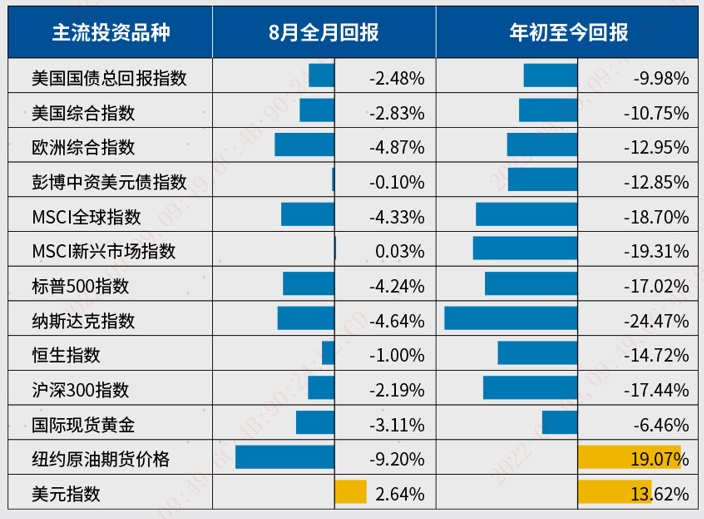 加息周期下,欧洲及美国的经济衰退担忧升温,叠加俄乌战争、台海演训、疫情反复、持续高温天气导致电力供应紧张,全球金融市场的情绪不断被扰动。在此背景下,全球主要资产年初至今整体表现较差。截止 2022 年 8 月 31 日,除了和美元挂钩的货币型产品等少数资产价格上涨,其他各类资产普遍下跌。