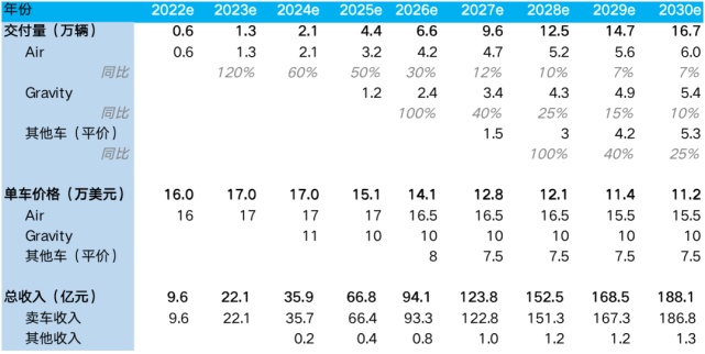 According to Lucid's plan, Gravity will be launched smoothly in 2024, and another more affordable model will be launched smoothly in 2026. Taking into account its current actual execution capacity, we assume that it will be delayed by one year.