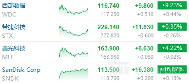 Storage: Morgan Stanley significantly raised the target prices for two storage companies. Western Digital's target price was raised from $99 to $171, and Seagate Technology's target price was also raised from $168 to $265. Western Digital is also the bank's "top pick."