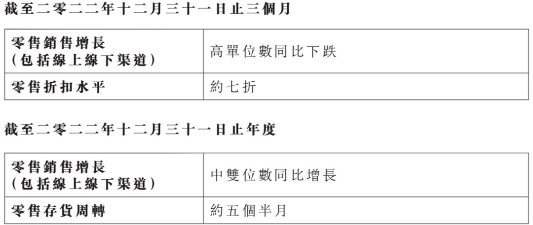 所有其他品牌产品的零售金额与 2021 年同期相比取得 10%-20% 的增长。