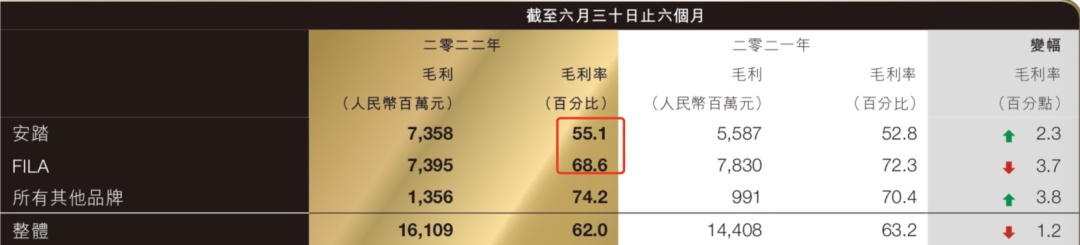 毛利虽下降,但 FILA 拥有的 68.6% 的毛利率仍高于自主品牌安踏的 55.1%。所以,尽管安踏主品牌和其他品牌毛利率均有所上升,仍难挽回集团整体毛利率的下滑的事实。