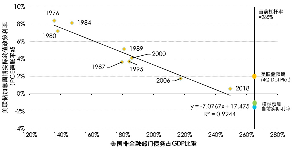 美联储加息周期的实际终值利率(Real Terminal Rate) 与当期美国经济的杠杆率有着稳定的负相关关系。鉴于当前 265% 的杠杆水平,本轮终值利率的理论水平在-1.3% 左右,当前已经与之接近。然而,根据美联储点阵图的预期,联储打算将本轮的实际终值利率水平提升到 2% 附近。如果这一做法 2023 年得到贯彻,将意味着金融风险大幅上升。