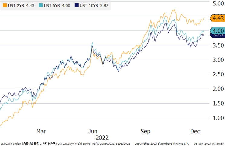 2022 年美元债券市场经历了历史上其中一次最为剧烈的下跌,彭博美国国债指数、投资级公司债券指数及高收益指数分别下跌了 12.46%、15.76% 及 11.19%。中资美元债券也未能幸免,投资级及高收益债券指数分别下跌 10.11% 及 22.47%。美国投资级及中资投资级信用利差分别走宽 38bp 及 24bp。2 年期和 10 年期美国国债全年分别上涨 369bp 及 236bp 至 4.43% 及 3.87% 的位置。