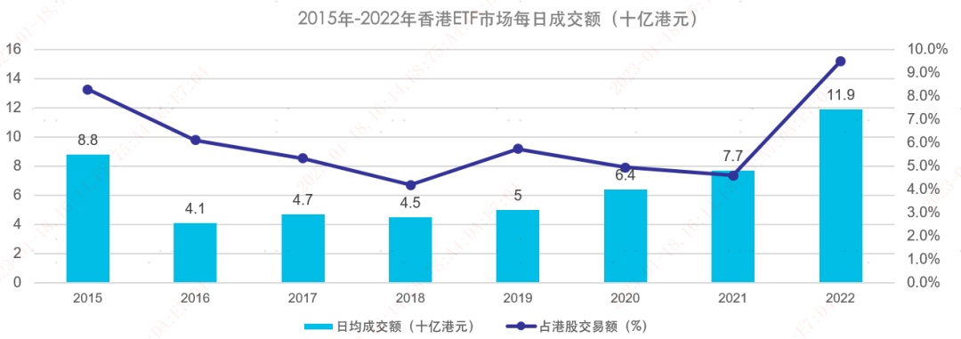 - 2022 年香港 ETF 的平均每日成交金额为 119 亿港元,较 2021 年的 77 亿港元上升 54%,占股票市场总成交额约 9.5%;