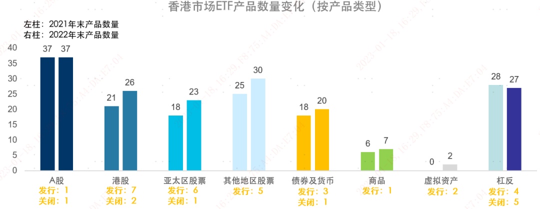 2022 年全年香港市场总计新发行 29 只 ETF,关闭 9 只 ETF,新产品发行以港股 ETF 为主。A 股类 ETF 发行 1 只,关闭 1 只;亚太区股票类 ETF 发行 6 只,关闭 1 只;其他地区股票类 ETF 发行 5 只;债券及货币类 ETF 发行 3 只,关闭 1 只;商品类 ETF 发行 1 只;虚拟资产类 ETF 发行 2 只;杠反类 ETF 发行 4 只,关闭 5 只。