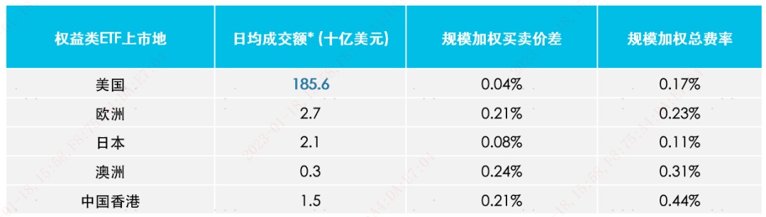 根据彭博统计,截至 2022 年底,美国权益类 ETF 日均成交额 1856 亿美元,远远超越全球其他地区。