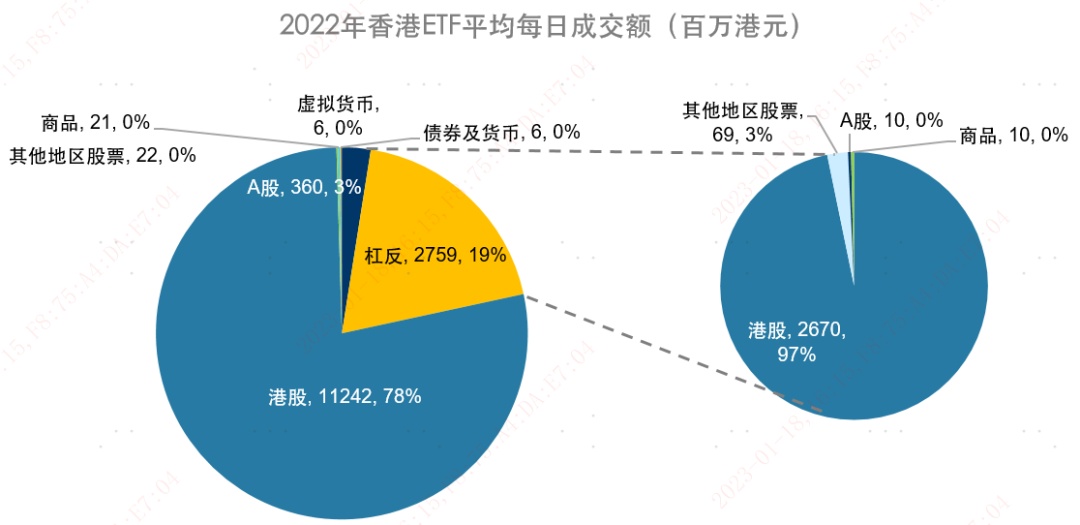 注:1. 每日成交额为该市场所有 ETF 产品加总成交额。2. 亚太区股票:投资地区包括除纯 A 股、纯港股外的大中华区、越南,日本,台湾,印度、韩国等市场。3. 其他地区股票:为除 A 股、港股、亚太区股票之外的其他市场股票,包括全球市场,全球新兴市场、东盟、美国、欧洲等市场。数据来源:香港交易所,易方达。统计区间为 2022 年 1 月 1 日至 2022 年 12 月 31 日。