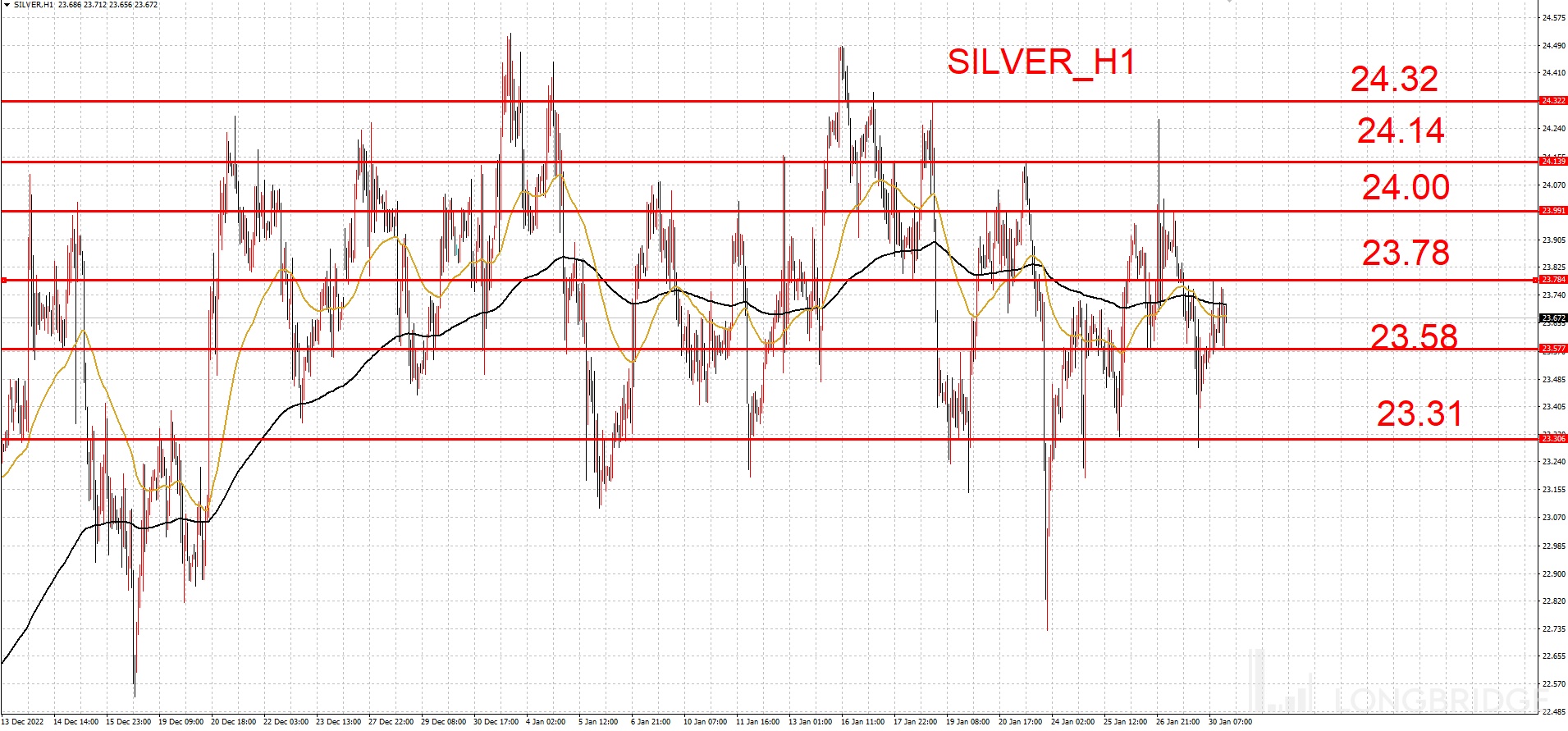 下方支撑 : 23.78 / 23.58 / 23.31 美元/盎司