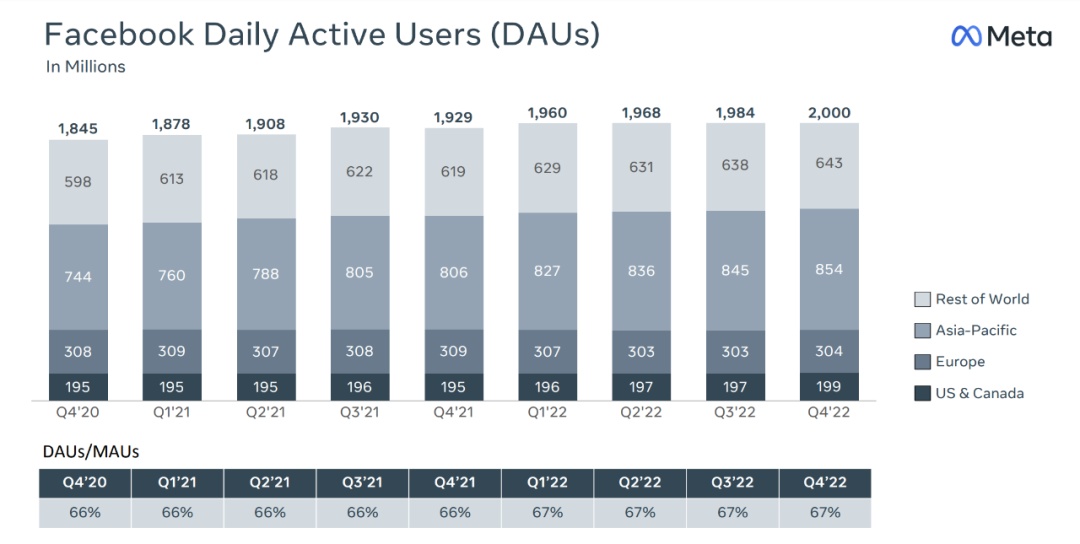 第二个原因是,基本盘 Facebook 用户仍在增长,社交家族用户数量并未持续下降。去年第一季度脸书用户数量的首次下降导致 Meta 遭受重创,导致数千亿市值瞬间蒸发。然而,这种下降趋势似乎没有持续下去。第四季度,Facebook 的日活跃用户数首次突破 20 亿大关,比一年前增加了 7000 多万。整个社交家族应用的日活跃用户达到 29.6 亿,继续保持同比和环比增长。