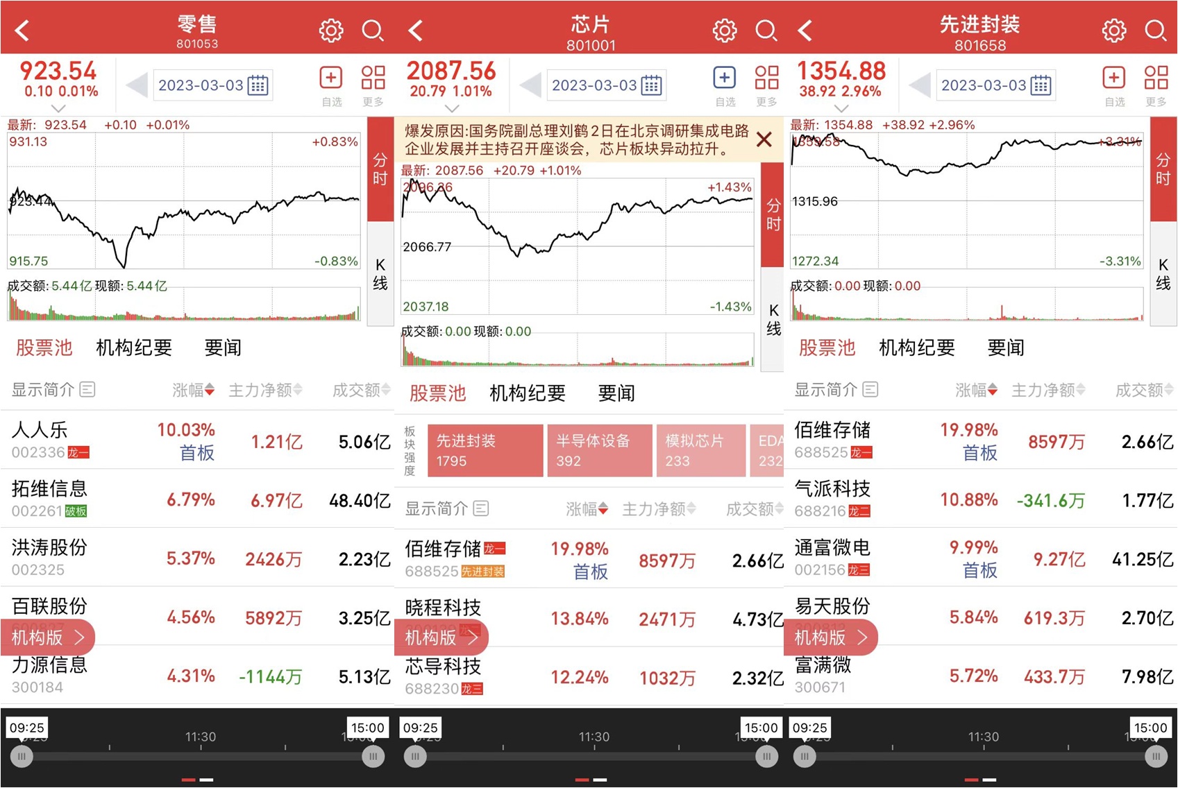 因此可以看到零售、芯片、先进封装三个板块当日表稍好,板块内涨停个股较多。