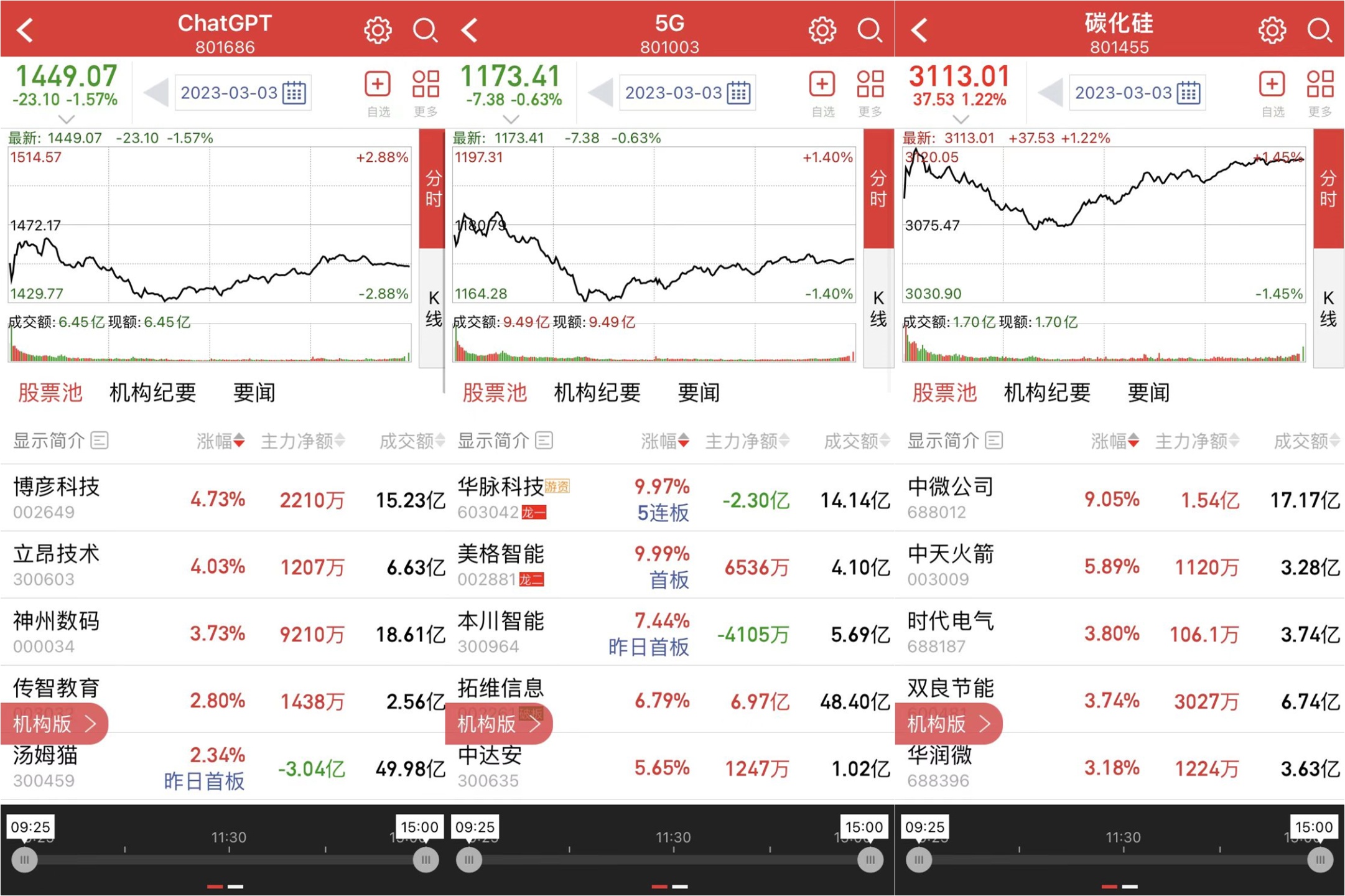 而 ChatGPT、5G、碳化硅三个板块当日表现均较差,板块内涨停个股较少。