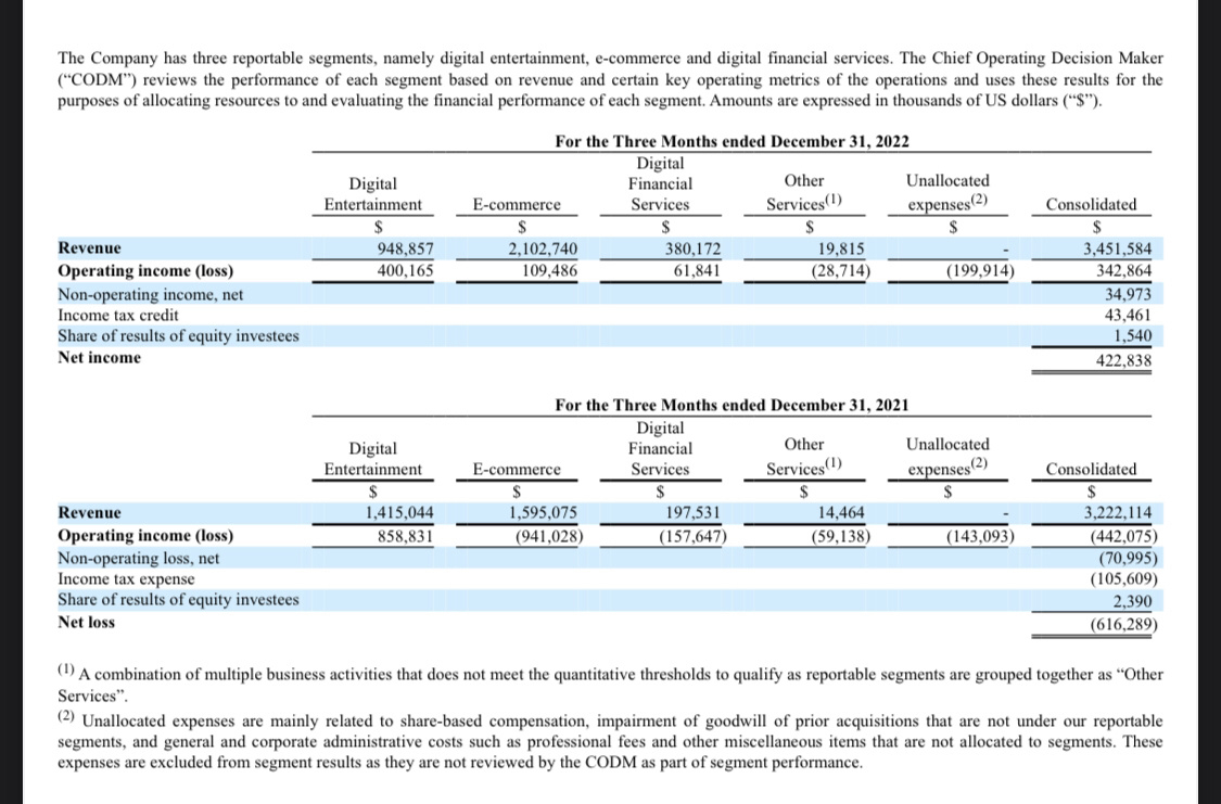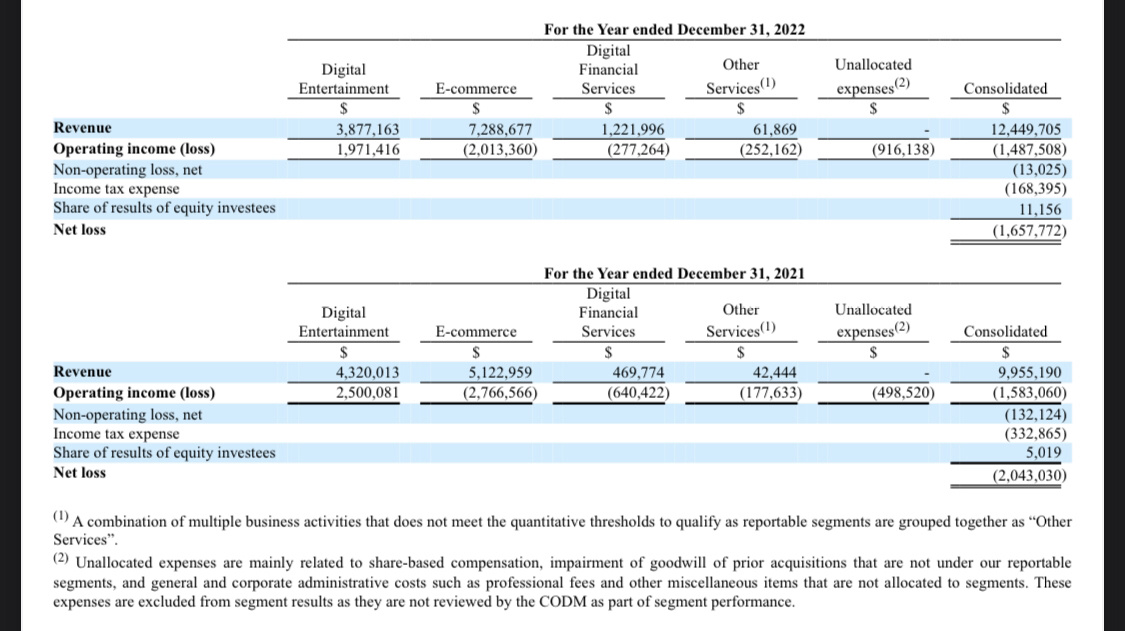 整个 2022 年度来看,SEA 的总营收为 124 亿美元,同比增长 25.1%;总毛利为 52 亿美元,同比增长 33.1%。尽管净亏损仍然较高,但相比上年净亏损 23 亿美元,已经有了明显的收窄。