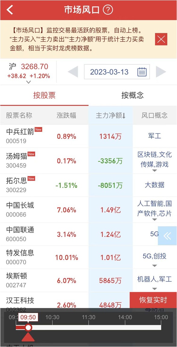 市场风口:市场风口是将两市 3000 多只股票,利用大数据监控市场交易最活跃的股票,由 3000 个减少到 30-50 个,大大提高了 60 倍的看盘效率。主力买入卖出用于统计主力的买卖金额,当资金异动满足一定条件后会自动上榜,并给出概念分类。通过市场风口,可以辨别出资金去哪里了。通过拖动时间轴把每个时间点上榜的个股进行分类,及时发现盘面重点个股。也就是说,你不需要看着 3000 个股票了,你精力更集中了,也知道牛市中心点在哪。大概率的捕抓一线游资的动向