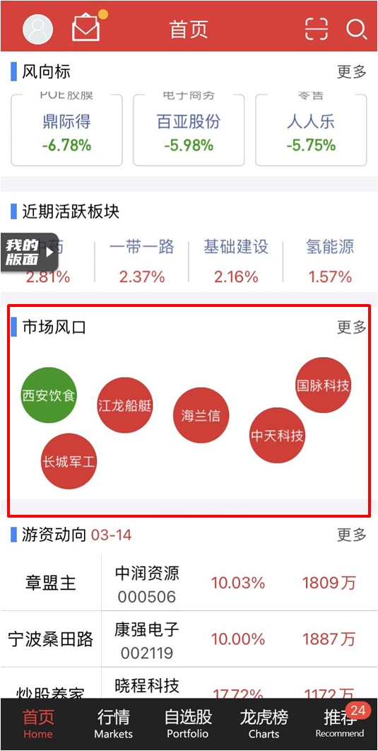 首先我们打开 “开盘啦” APP 点击首页,打开下方的市场风口: