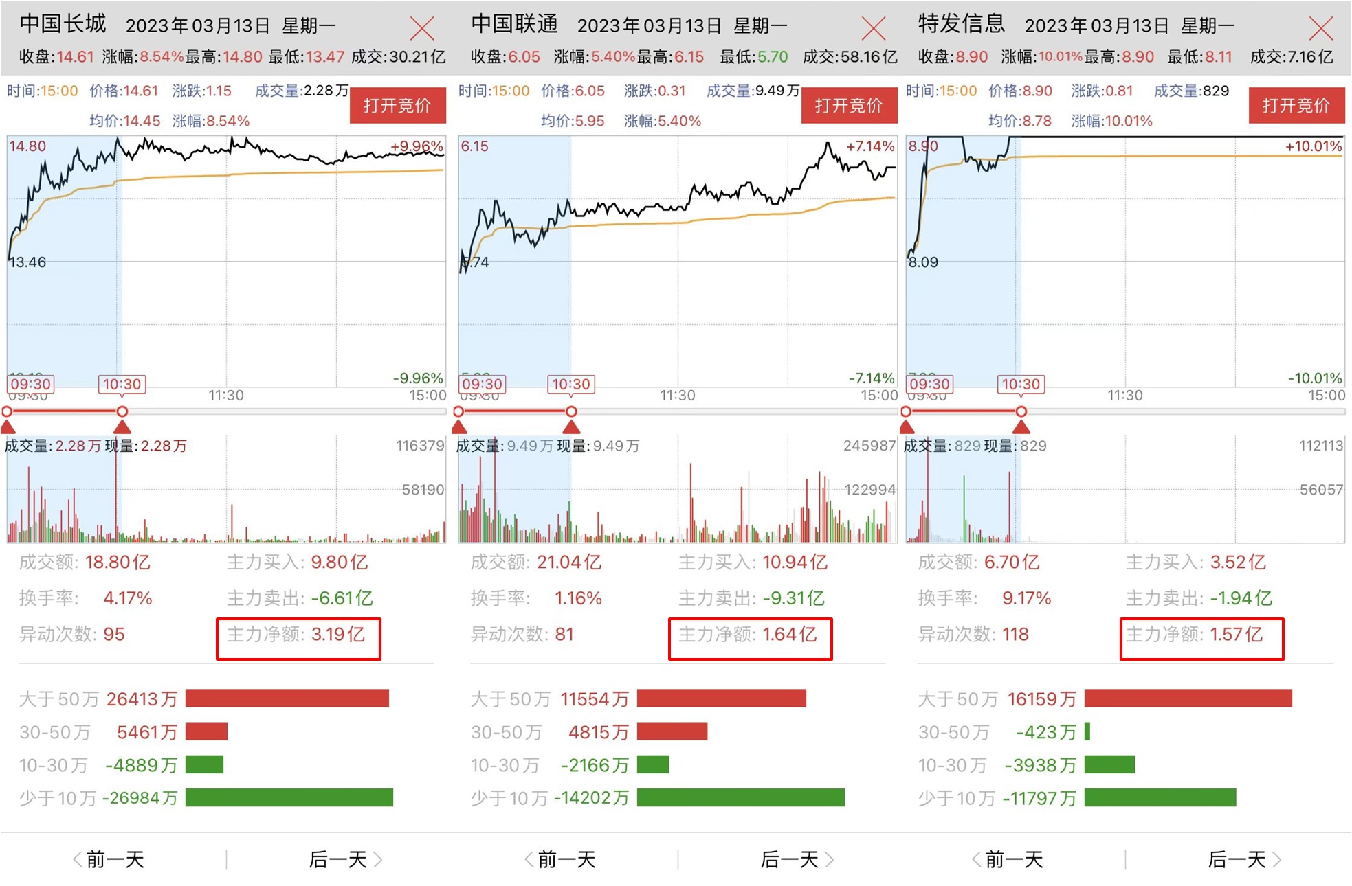 从当日 9 点 40 分的市场风口我们发现股票上榜,主力净额流入较大的有:中国长城1.49 亿、中国联通1.24 亿、特发信息1.01 亿。我们惊奇的发现 3 只个股均为科技类行业细分个股,资金如此的一致的共识难免会让人有所怀疑,是否科技类板块的细分板块会大涨。