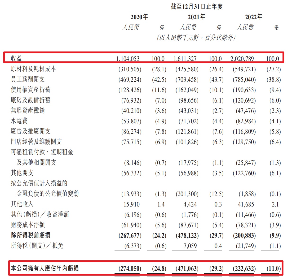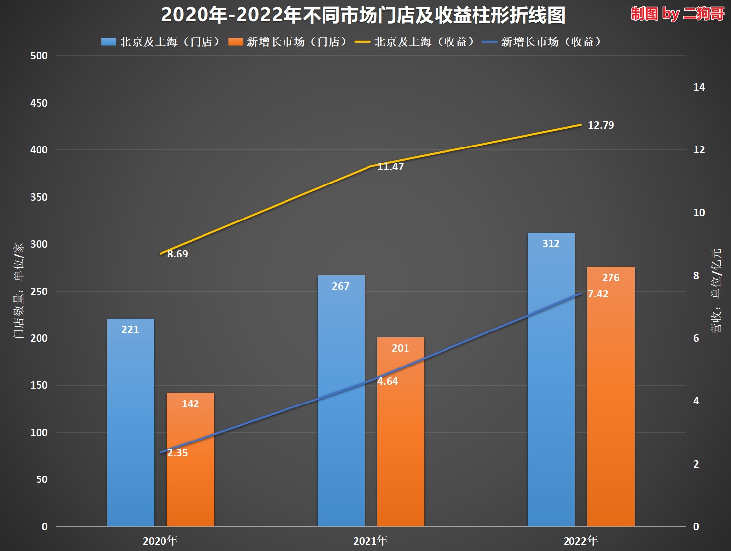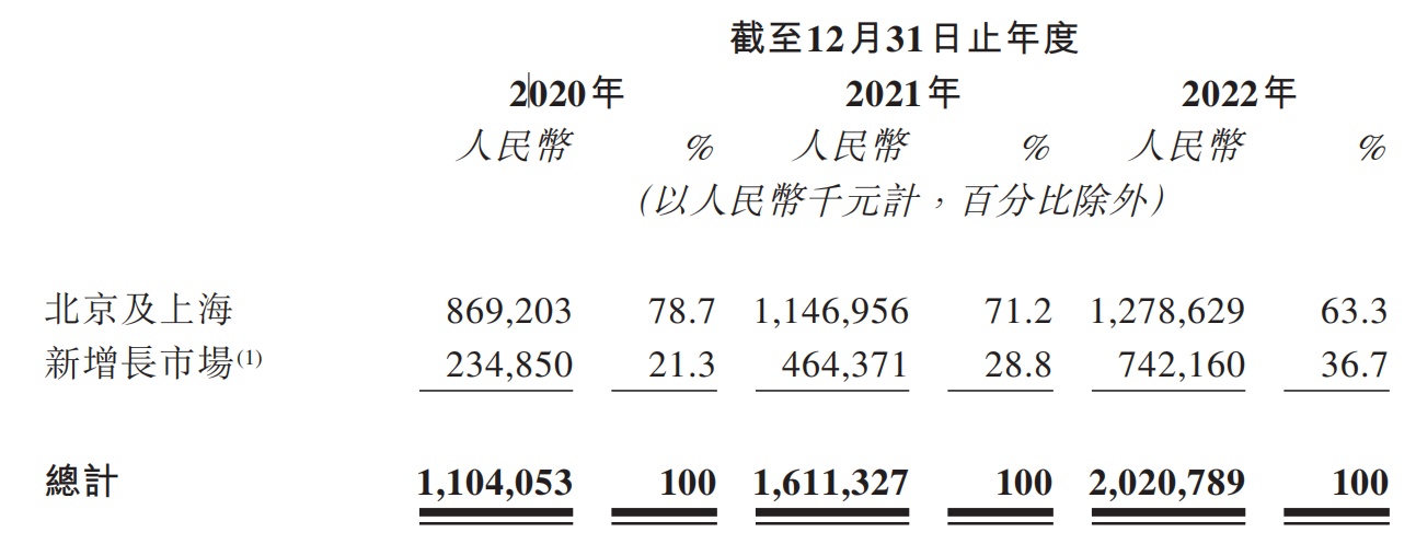 营收方面:公司从 2020 年至 2022 年实现总收入分别为 11.04 亿元、16.11 亿元、20.21 亿元,复合年增长率 35.30%,公司在营收增速方面还是比较不错的,主要还是得益于公司在新增长市场(主要指除了北京上海以外的市场)的快速扩张所致,二狗哥会在后面章节进行介绍。