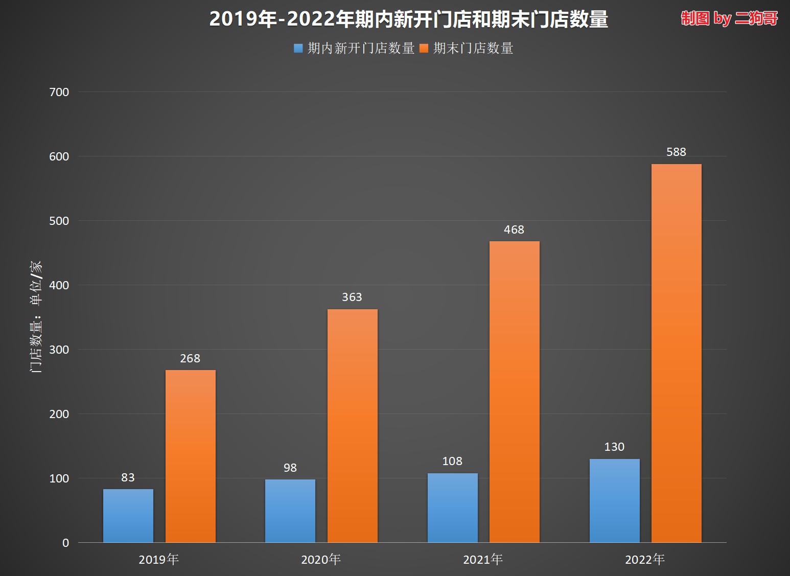 门店数量:根据招股书显示,旗下门店数量由 2019 年的 268 家增长 119.4% 至截止 2022 年 12 月 30 日的 588 家,复合年增长速度 26.86%,公司在开店速度方面还是比较克制的,并没有走那种快速铺店模式,这样的结果就是能够保证开店质量,不过容易错失市场。