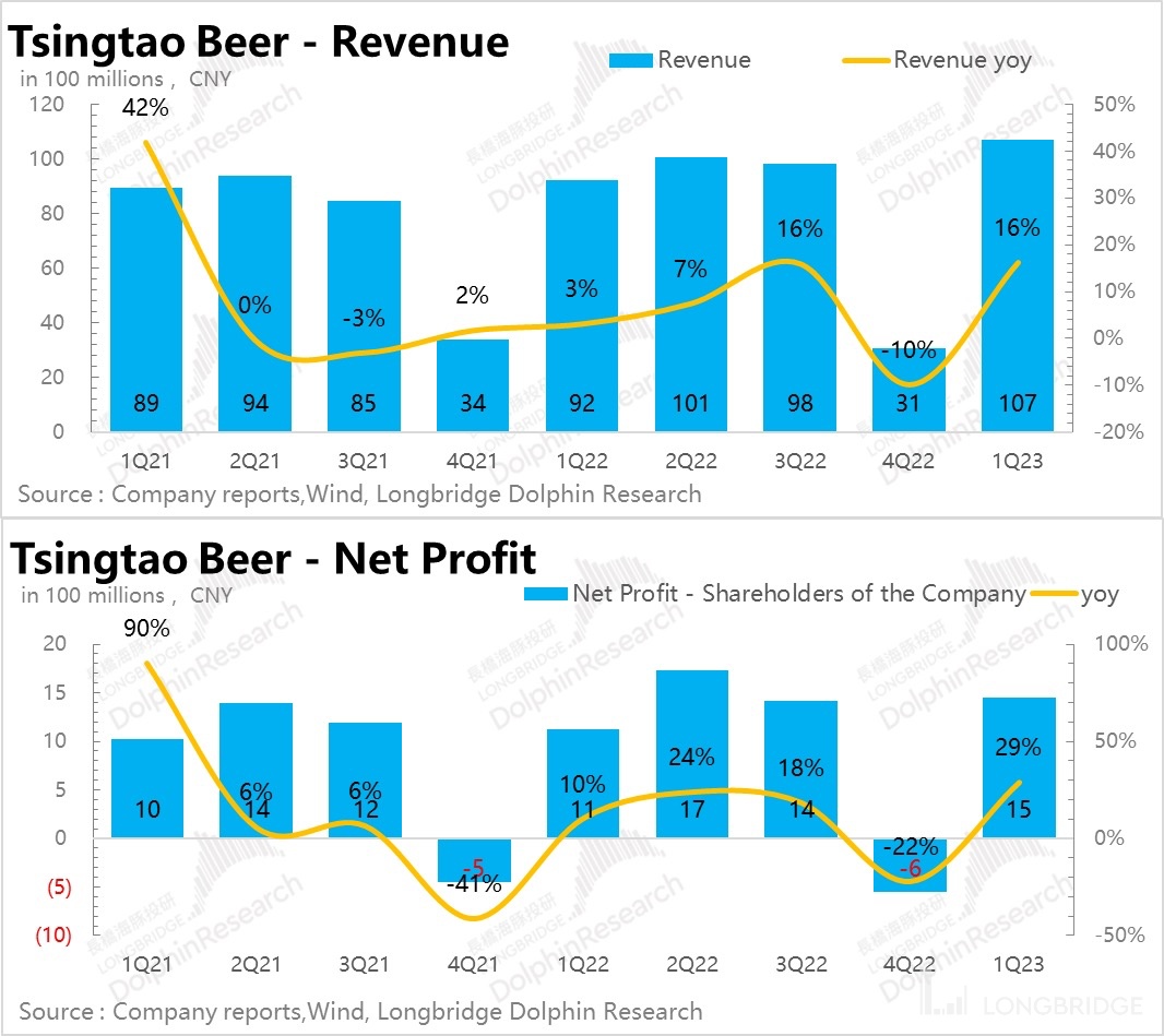 The first quarter has achieved a better growth trend. The rise in both price and quantity can't be underestimated. In the fourth quarter of last year, there was a small problem with single-quarter sales volume, which did not continue the previous growth trend, but fortunately it adjusted in the first quarter of this year. Qingdao's main brand and other brands have achieved good growth in terms of quantity, but the growth of Qingdao's main brand is slightly slower.