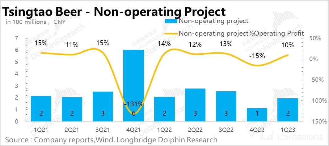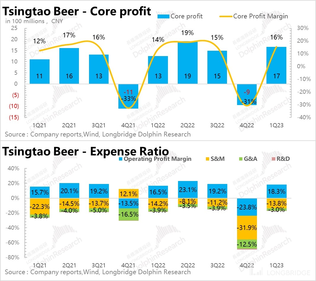 3. Continuous improvement in cost control and core profitability: In the fourth quarter of last year, Qingdao Beer's profit was mainly reliant on saving costs. In the first quarter of this year, this trend continued, with a reduction of 1.2% in main cost items (sales, management & research and development). Coupled with the 0.5% increase in gross margin, it greatly helped the profitability.
