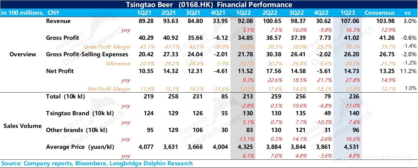 After the Hong Kong stock market closed on April 24th Beijing time, Qingdao Beer Co., Ltd./Qingdao Beer (0168.HK/600600.SH) released its financial report for the first quarter of 2023. Overall, the company's first-quarter revenue exceeded market expectations (by more than 300 million yuan, 3%), and net profit attributable to mother also exceeded market expectations (by more than 150 million yuan, 11%). Achieved historical highs in product sales, revenue, and profit for a single quarter.