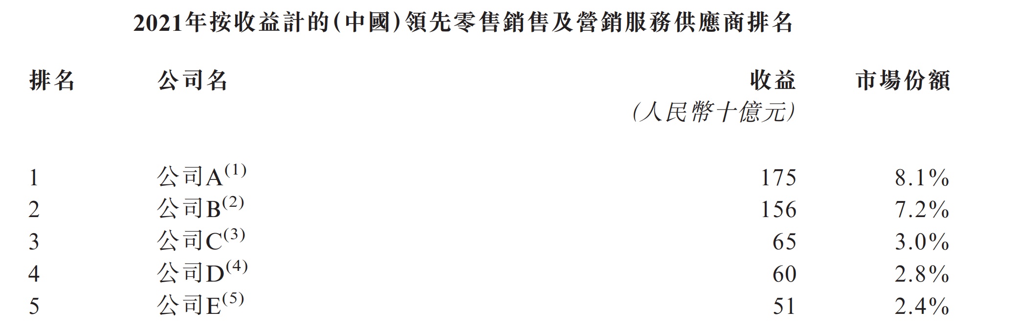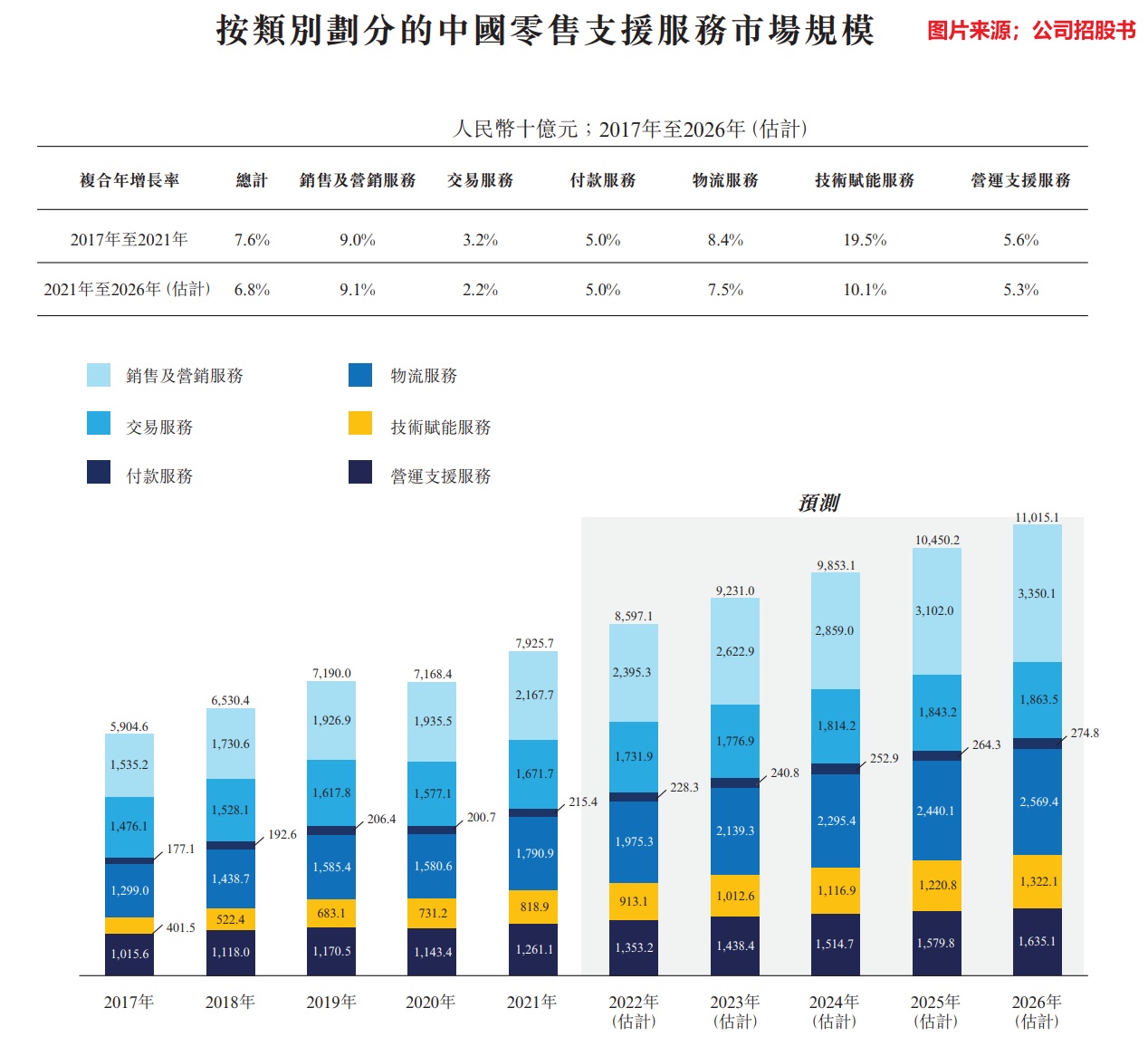 根据弗若斯特沙利文报告,中国的零售支援服务市场收益由 2017 年人民币 5.9 万亿元增至 2021 年人民币 7.9 万亿元,过去五年间的复合年增长率为 7.6%。自 2021 年至 2026 年,预期零售支援服务市场收益于未来五年将按复合合年增长率 6.8% 增长至人民币 11.0 万亿元。具体而言,销售及营销服务是一个重要类别,在零售支援服务市场占比超过 50%,于 2017 年至 2021 年间实现了 9.0% 的稳定复合年增长率,从行业发展来说,这块蛋糕真的是很大,当然竞争也是更加激烈。