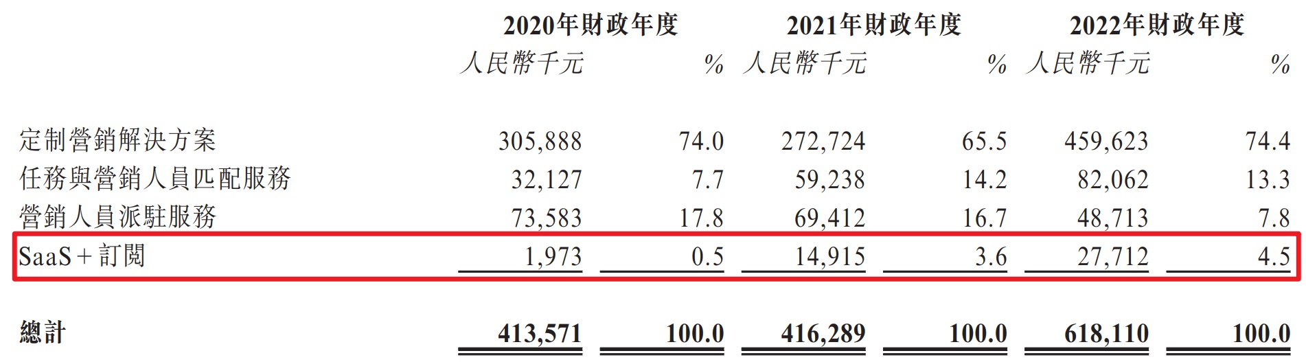 - .SaaS+ 订阅。公司提供现成数字化工具的定制(按需)及订阅,通过数字化工具支持客户简化其销售及营销流程以及管理其线下零售网络,并作出数据导向的决策。于业绩记录期各年分别占总营收的 0.5%、3.6% 及 4.5%。
