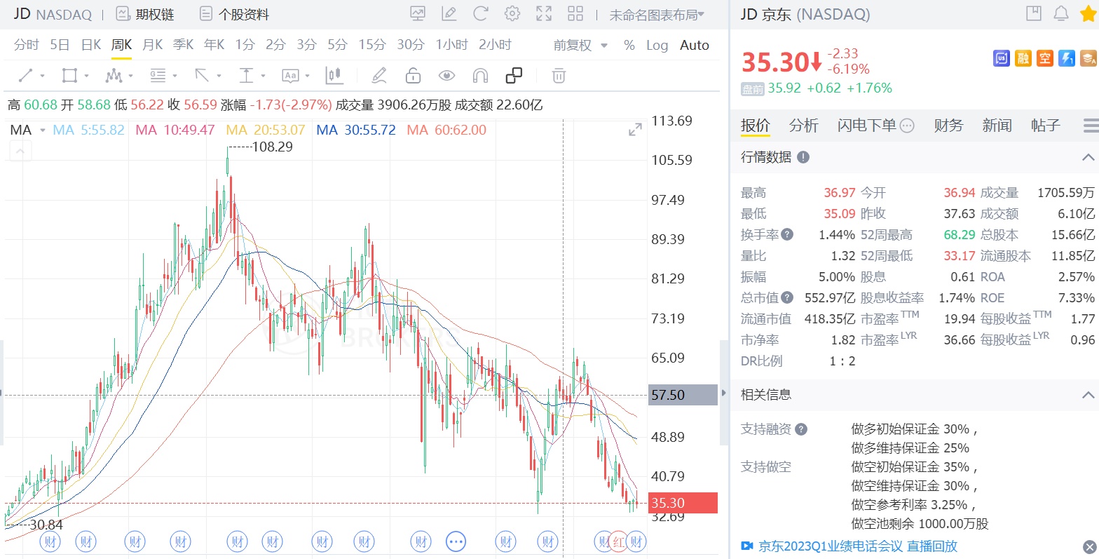 大家好,我是石头。今天跟大家聊聊京东,京东最近发布了 2023Q1 财报,财报发布后股价大涨超过 7%,但是第二个交易日就出现了下跌。