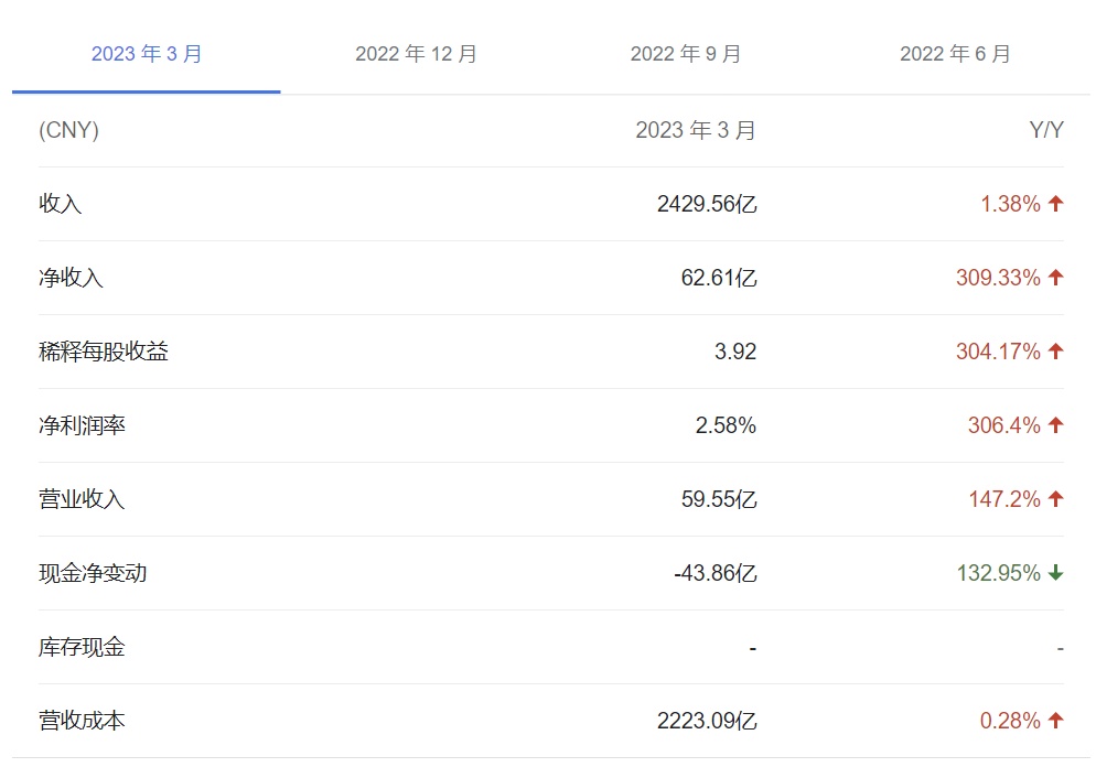 收入成本:2023 年第一季度的收入成本从 2022 年第一季度的人民币 2062 亿元增长 0.4% 至人民币 2069 亿元(约 301 亿美元)。