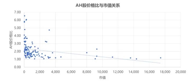 看到这张图,大家有没有一个疑问:明明很多股票溢价好几倍啊,为什么溢价指数只有 131 点?想到这个问题的再次提出表扬。这里军师解释一下,如果把 124 家公司的 AH 股对价和市值做成一张散点图,并加入一条趋势线,就得到这样一张图,有个大概规律:越是大盘股,价格比(对价)越小,比如最右边这个点是工商银行,AH 对价只有 1.2,市值有将近 2 万亿,又因为这个溢价指数是市值加权的,大市值公司权重大,所以指数只有 131 点。