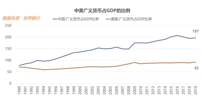 前面军师说了,股价是股票和资金(也就是钱)的供需关系的反应,下面我们看看 “钱” 这个维度,都说中国 “人傻钱多”,下面看看 “钱” 究竟有多多?世界银行 “广义货币” 的统计口径比中国的 M2 稍大一点,可以大概理解为广义货币就是现金加上居民和企业的活期、定期存款,跟普通人对 “钱” 的认知基本一致。我们发现 2019 年中国的广义货币占 GDP 的比重约为 200%,美国是 93% 左右。
