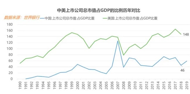 下面我们用上市公司总市值除以 GDP,得到下面这张图,我们看到 2018 年中国上市公司总市值为 GDP 的 46%,美国是 148%,所以美国股票这个投资品种的相对体量比中国大得多。