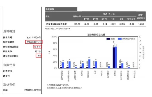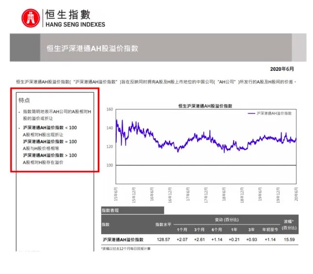 我们打开官网找到这个指数,这里大家只需要知道:当这个指数大于 100,代表 A 股相对于 H 股是溢价的,小于 100 代表 A 股相对 H 股是折价的。成分股调整、权重等信息有兴趣的朋友可以自己去看看。