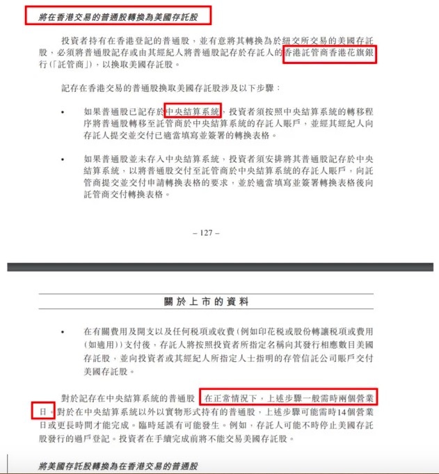 招股书 127-128 页里面写了投资者如何将港股和美股相互转换,军师做了一张图来说明(做了简化)。